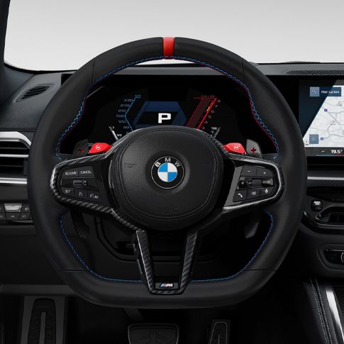 赛道级驾驭,尽在掌控。M运动型多功能真皮方向盘,以12点方向的红色回正标记,彰显鲜明赛道风范;醒目M标识与M配色缝线,唤醒竞速天性。